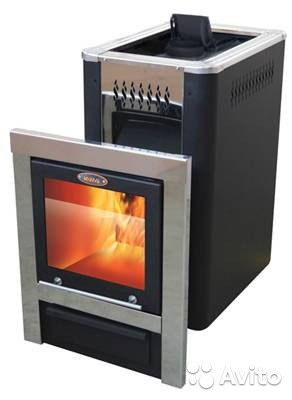 Особенностями данной модели можно назвать закрытую каменку, рассчитанную на 40–45 кг камней, и увеличенный размер каминного экрана, создающего особую обстановку в предбаннике, откуда в топку закладываются дрова через удлинённый на 20 см топочный тоннель. Наличие камней объясняется необходимостью в максимально равномерном распространении по помещению горячего воздуха и пара. А полностью закрытая ёмкость каменки обеспечивает высокий уровень теплового КПД модели.