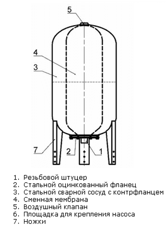 Работая как буферная ёмкость, позволяет автоматизировать работу насоса водоснабжения и уменьшить количество включений-выключений насоса. Вода, находясь внутри мембраны из каучука, не соприкосается с корпусом бака. Мембрана из бутилового каучука разделяет водяную и воздушную полости.