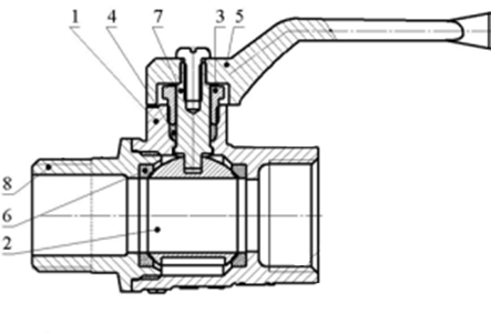 1. Корпус; 2. Пробка; 3. Гайка сальника; 4. Втулка сальника; 5. Ручка; 6. Седло; 7. Шпиндель; 8. Крышка уплотнительная