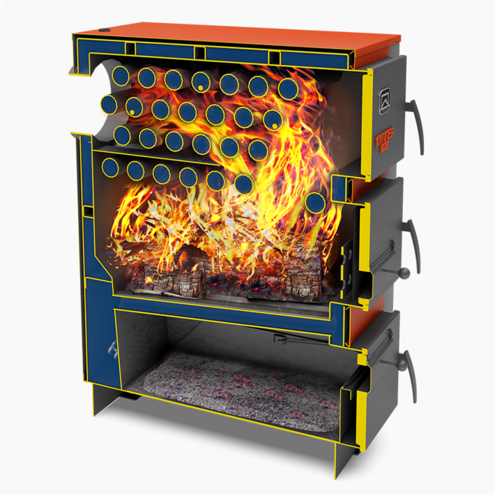Способность отдавать тепло столь длительное время стала возможной благодаря использованию в конструкции котла системы подачи вторичного воздуха в камеру сгорания и применению водотрубной колосниковой решётки, которая позволяет снимать тепло даже с тлеющих углей.