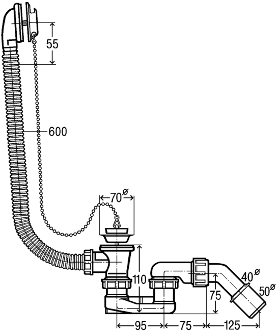 Артикул: 311537; Назначение: сифон для стандартной ванны; Сливное колено: 45°; Диаметр: 40/50 мм; Комплектация: гибкая переливная труба, накладка из нержавеющей стали, пробка, гидрозатвор; Материал: пластик; Производитель: Viega