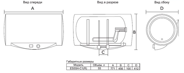 Объем: 55 л; Тип водонагревателя: накопительный; Способ нагрева: электрический; Установка: горизонтальная; Мощность: 2 кВт; Температура нагрева: 75°C; Габаритные размеры (ВхШхГ): 412х771х456 мм; Внутреннее покрытие бака: эмаль.