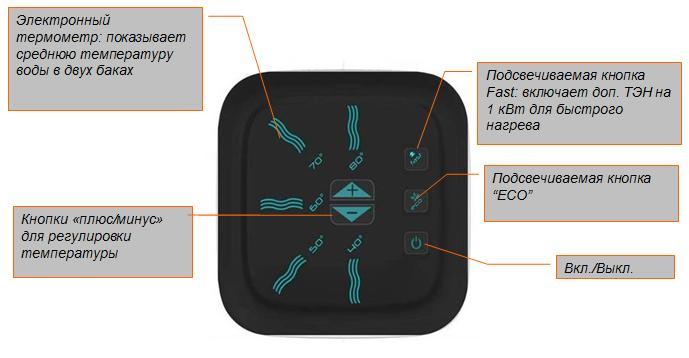 Водонагреватель оснащен современной панелью управления с цифровым дисплеем, отображающим установленный режим работы.Управление работой водонаревателя и программирование его функций и режимов производится с помощью понятных кнопок на передней панели.