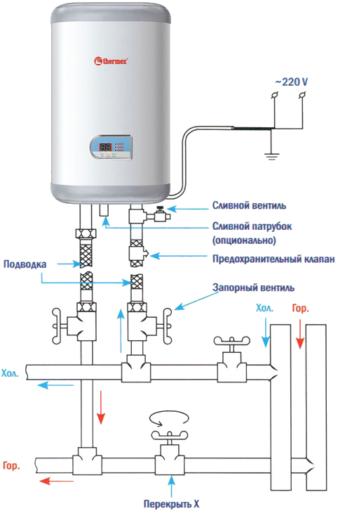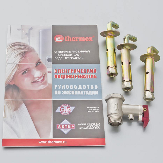В целях обеспечения безопасности в THERMEX IF 50 V предусмотрены термовыключатель и предохранительный клапан. Термовыключатель не допустит перегрева прибора и отключит его при температуре свыше 95С, а предохранительный клапан сбросит излишки давления в баке.