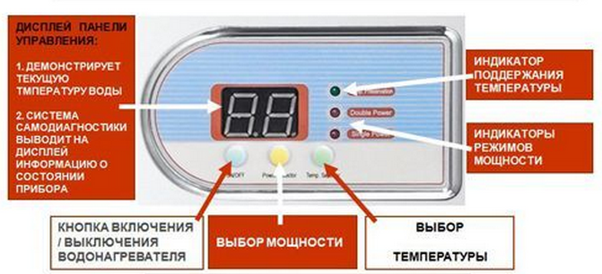 Два нагревательных элемента и три ступени мощности водонагревателя: 0,7 кВт, 1,3 кВт, 2,0 кВт